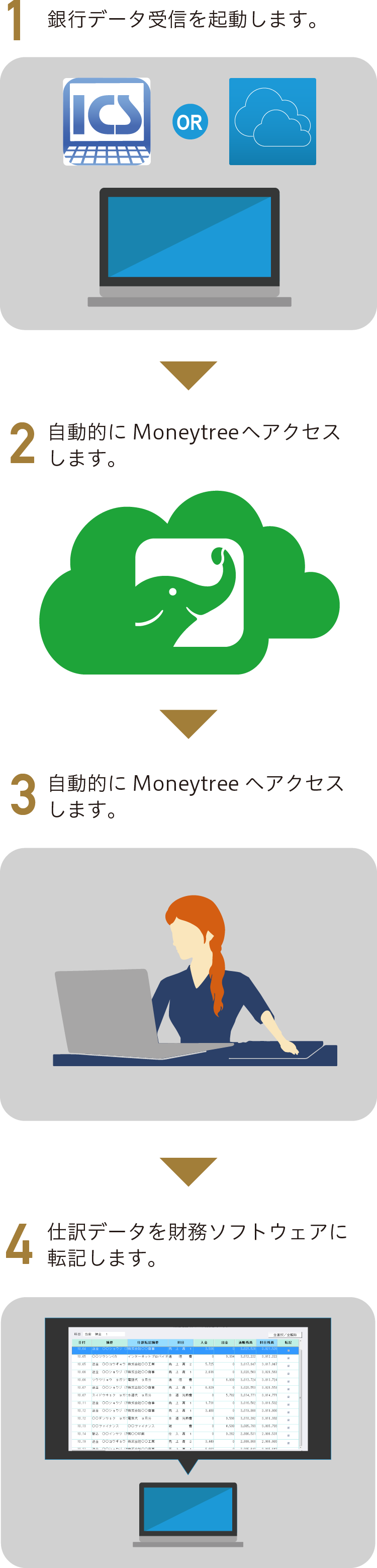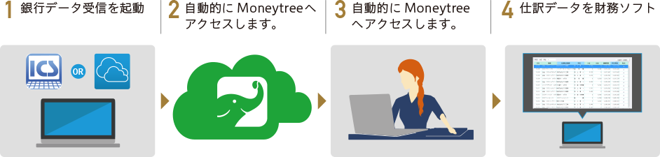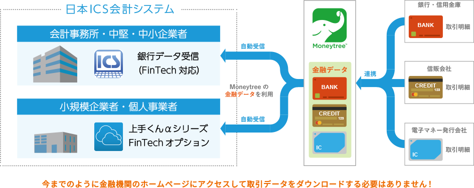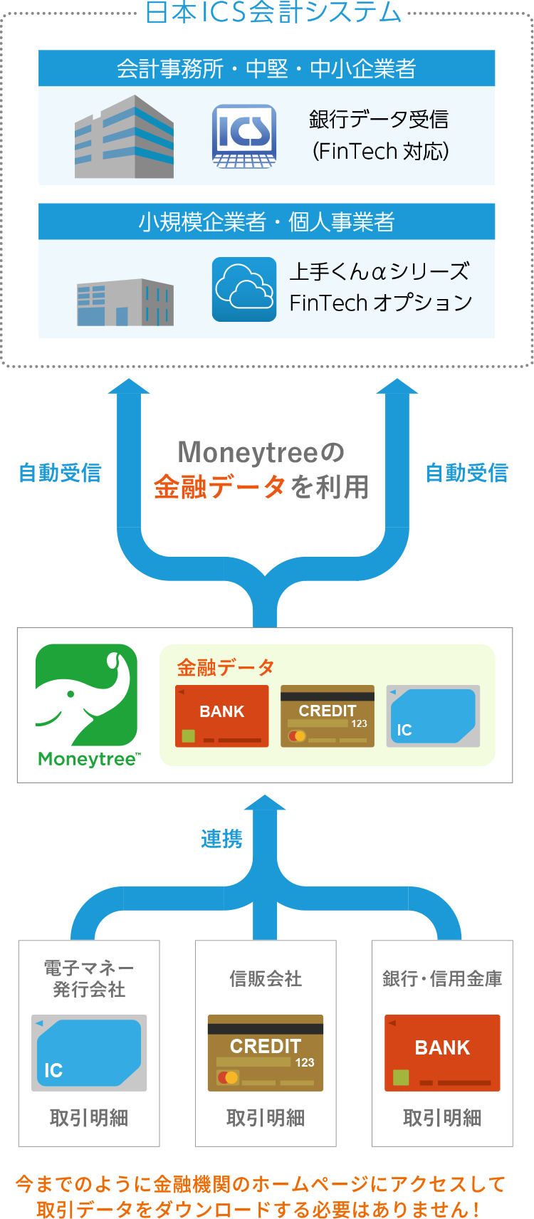 ICSのFinTechサービスは、ICSが販売している「銀行データ受信(FinTech対応)」とマネーツリー株式会社が提供する「Moneytree」を使い、インターネットを通じて連携することにより、銀行・クレジットカード・電子マネーなどの取引データを自動受信し、仕訳データを作成することができます。