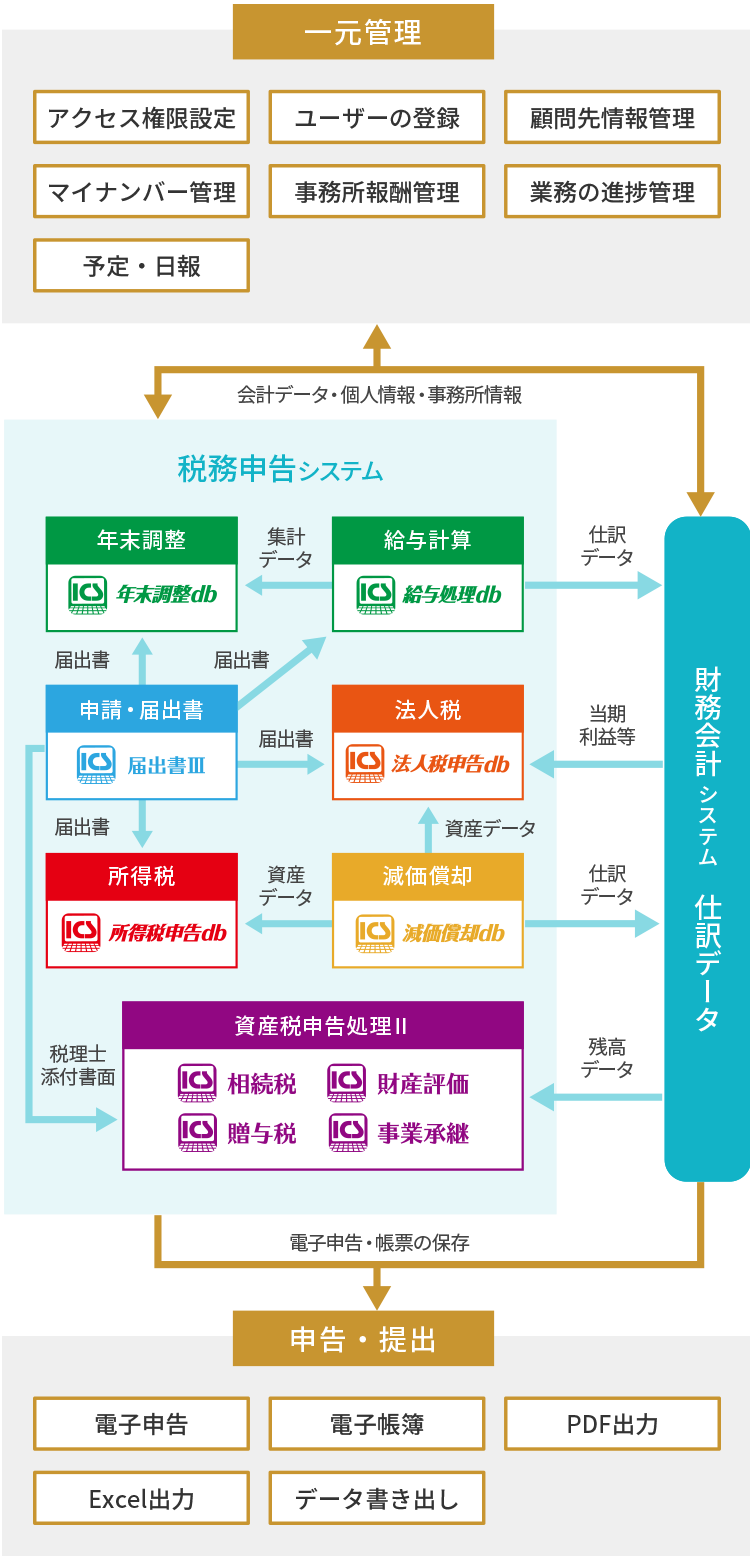 日本ICSでは、税務申告に関する様々なシステムをご用意しています。それぞれのデータををシステム間で連携させることで、仕訳データから電子申告まで一連の業務量の軽減を実現します。