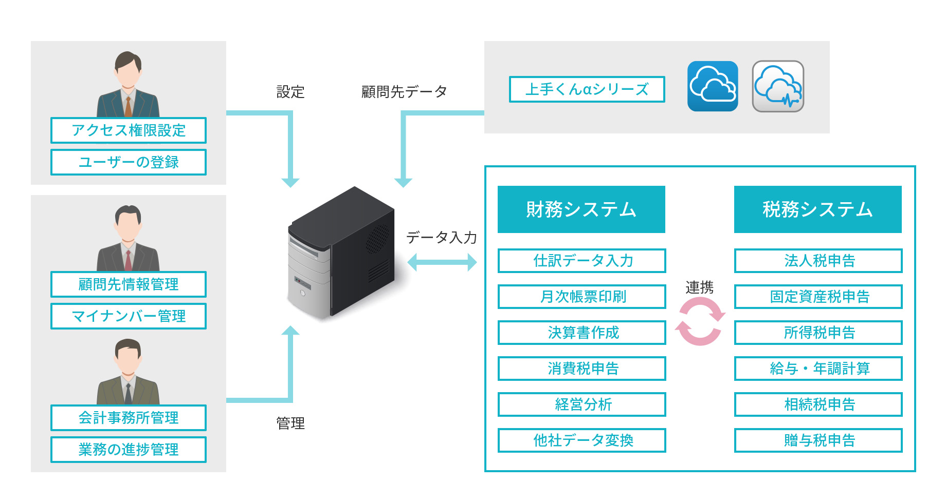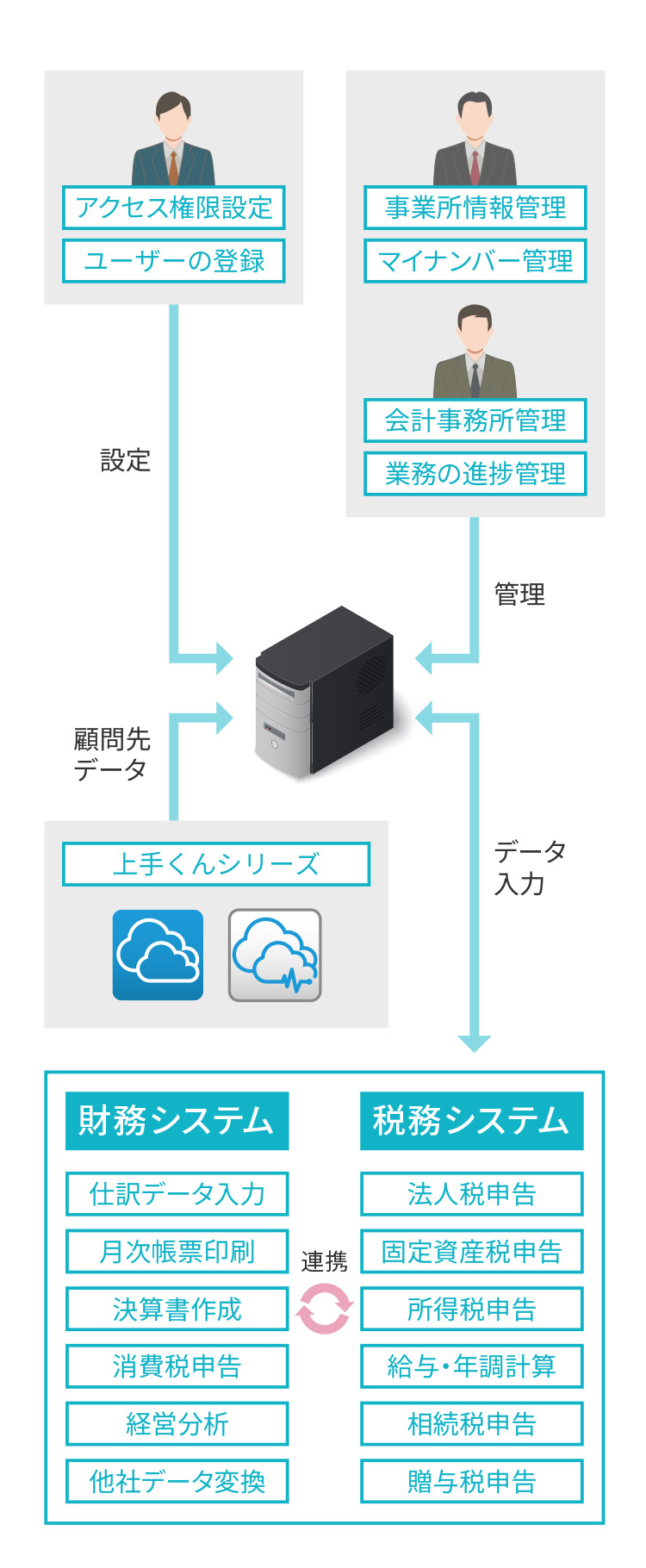 日本ICSのシステムは財務会計から法人税、所得税、資産税などの税務および電子申告まですべての処理が一連の作業で行える総合システムです。企業や個人事業主の情報は高いセキュリティで守られ、財務会計・税務申告・給与計算のシステム間を相互連携できるようにデータを一元管理することで、効率的で生産性の高い処理が行えます。